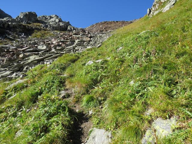 hier biegen wir links ab, und steigen über Wiesen mit Steinen versetzt, steil aufwärts