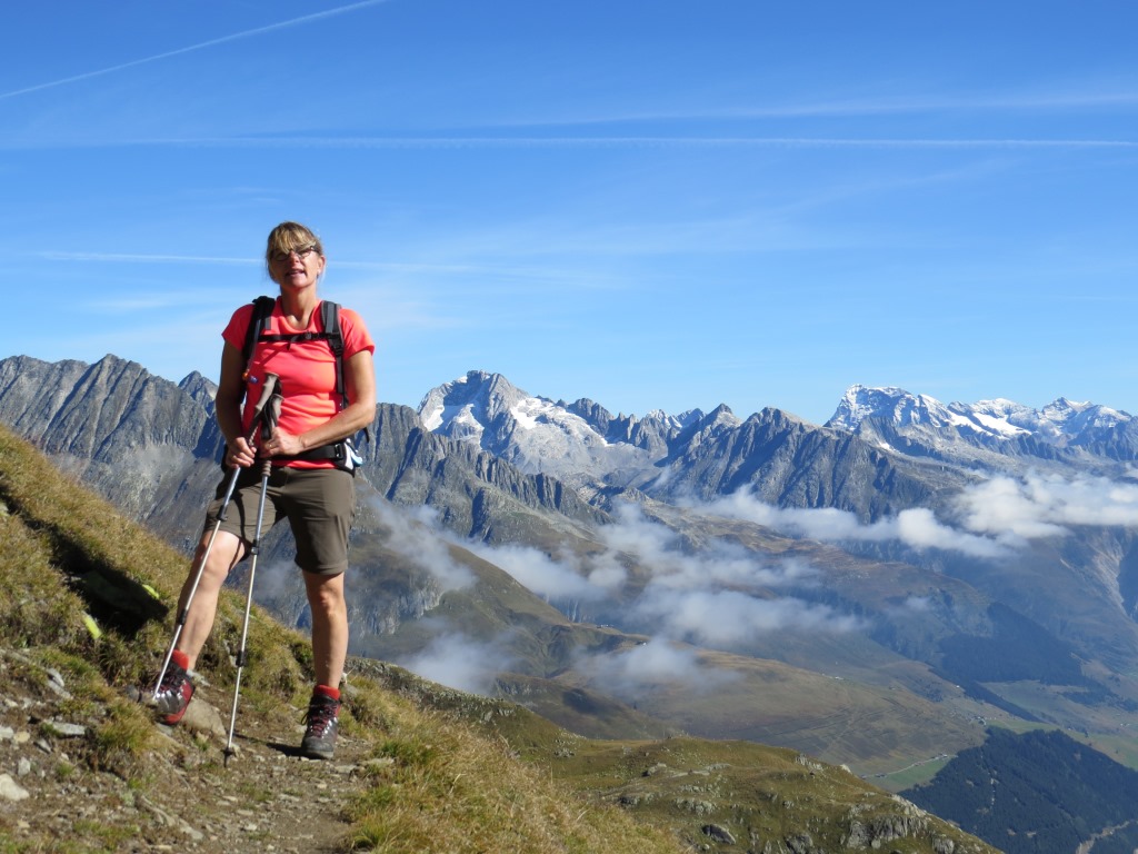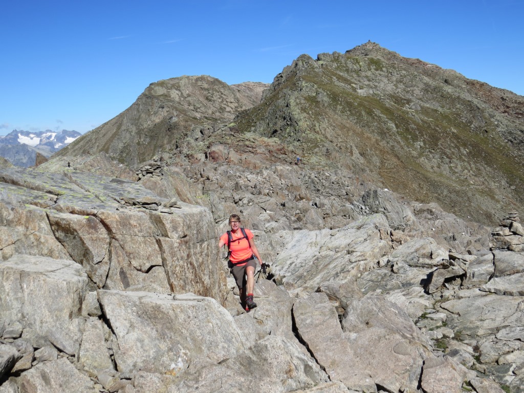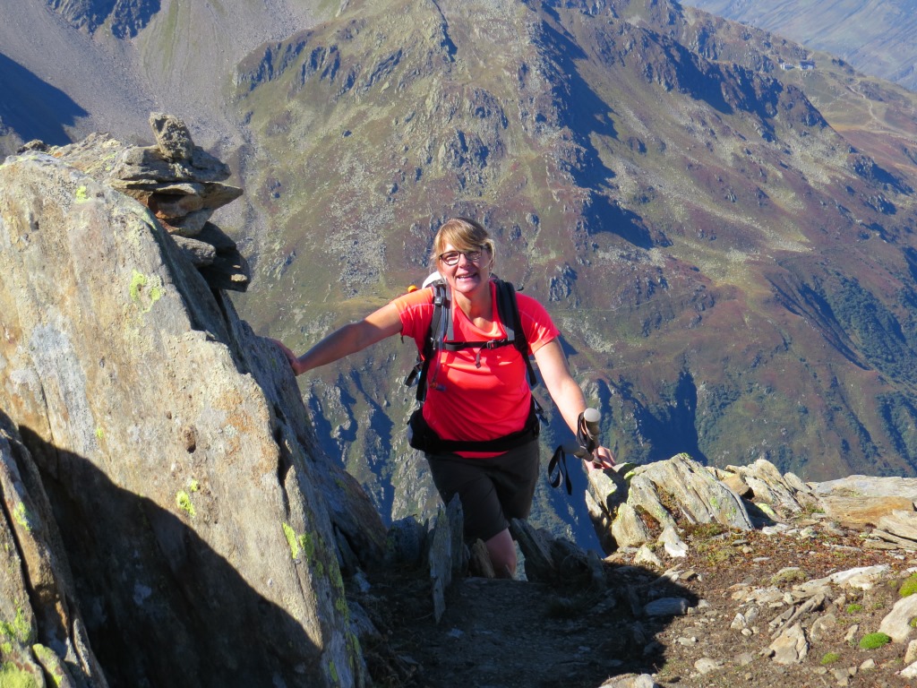 meine Maus auf dem Grat. Im Hintergrund Piz Tuma und Rossbodenstock