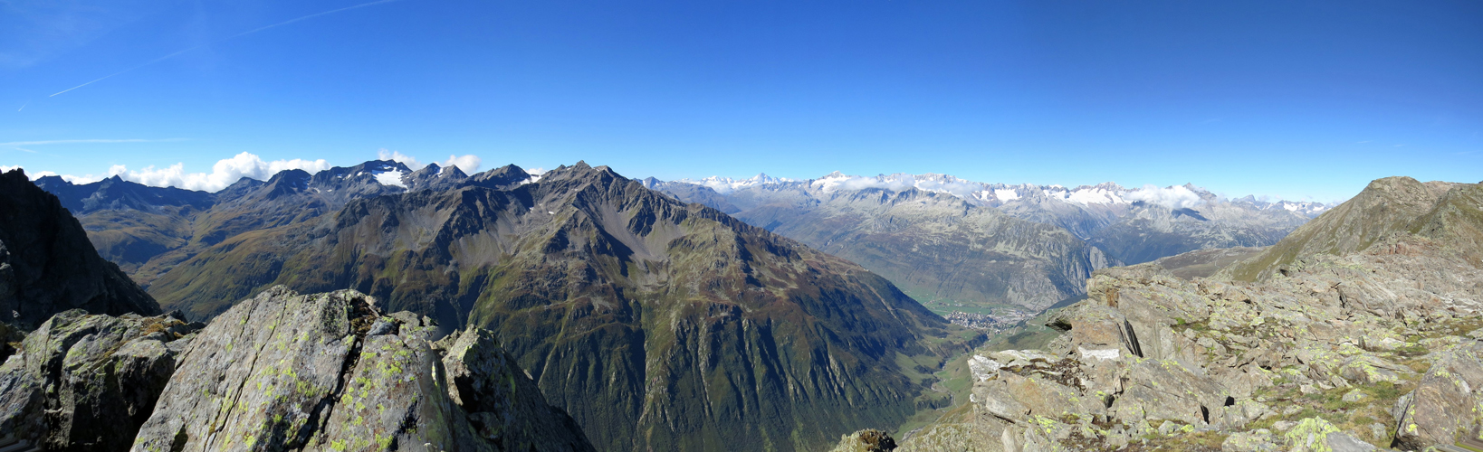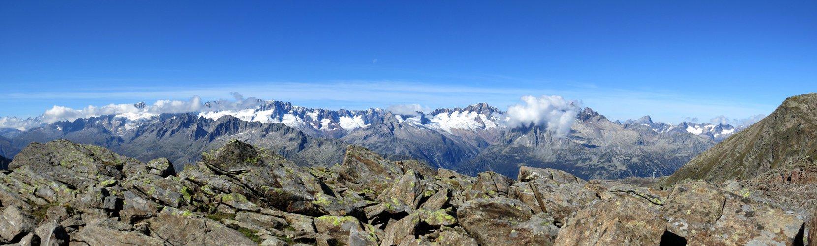 sehr schönes Breitbildfoto mit Blick in die Urner und Walliser Alpen. Dammastock, Sustenhorn usw.