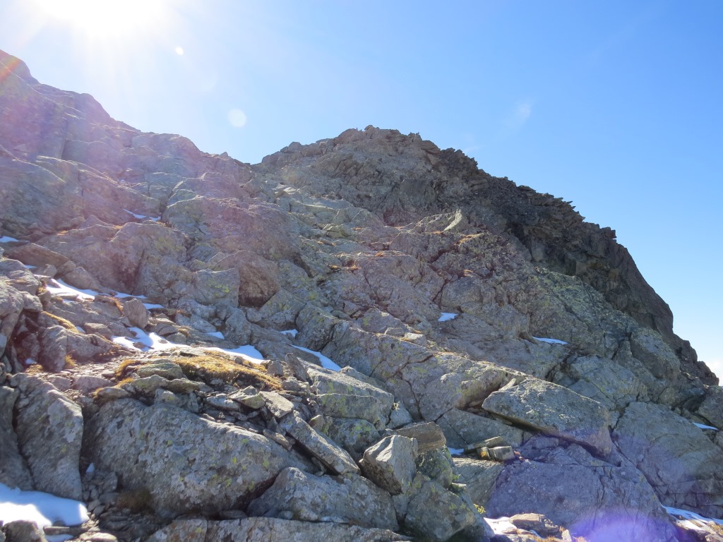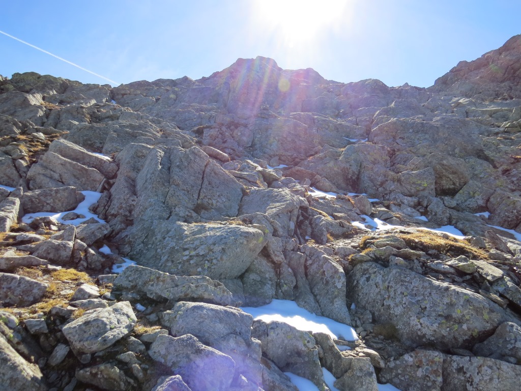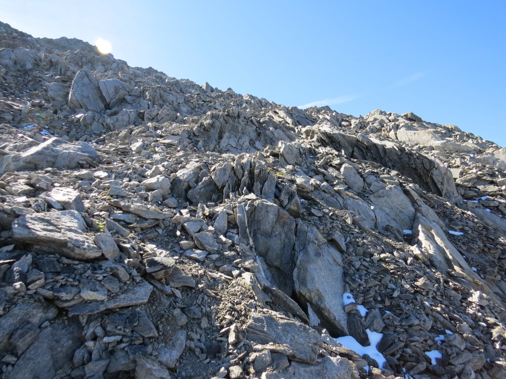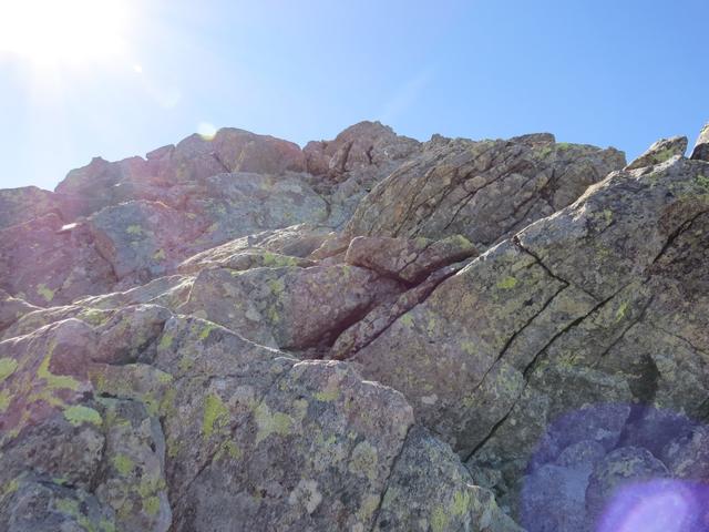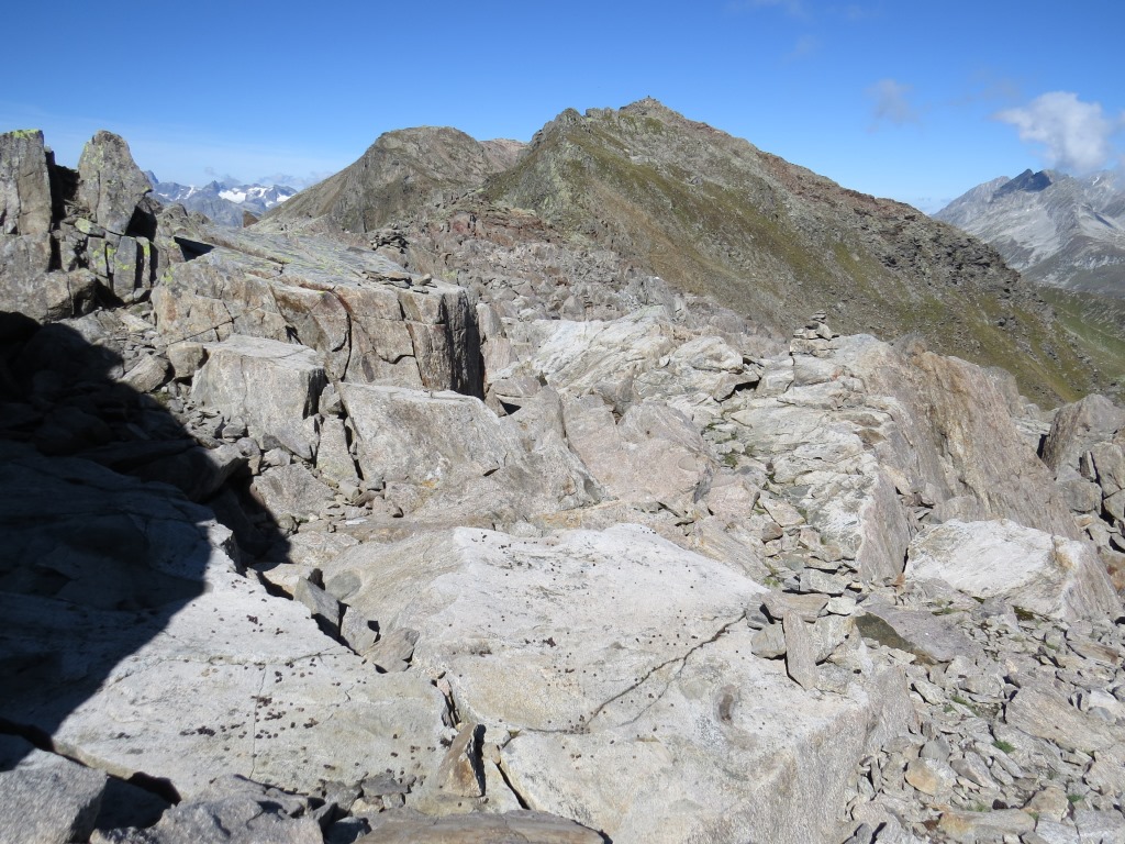 der Grat selbst besteht aus grobem Blockwerk und geschliffenem Fels...