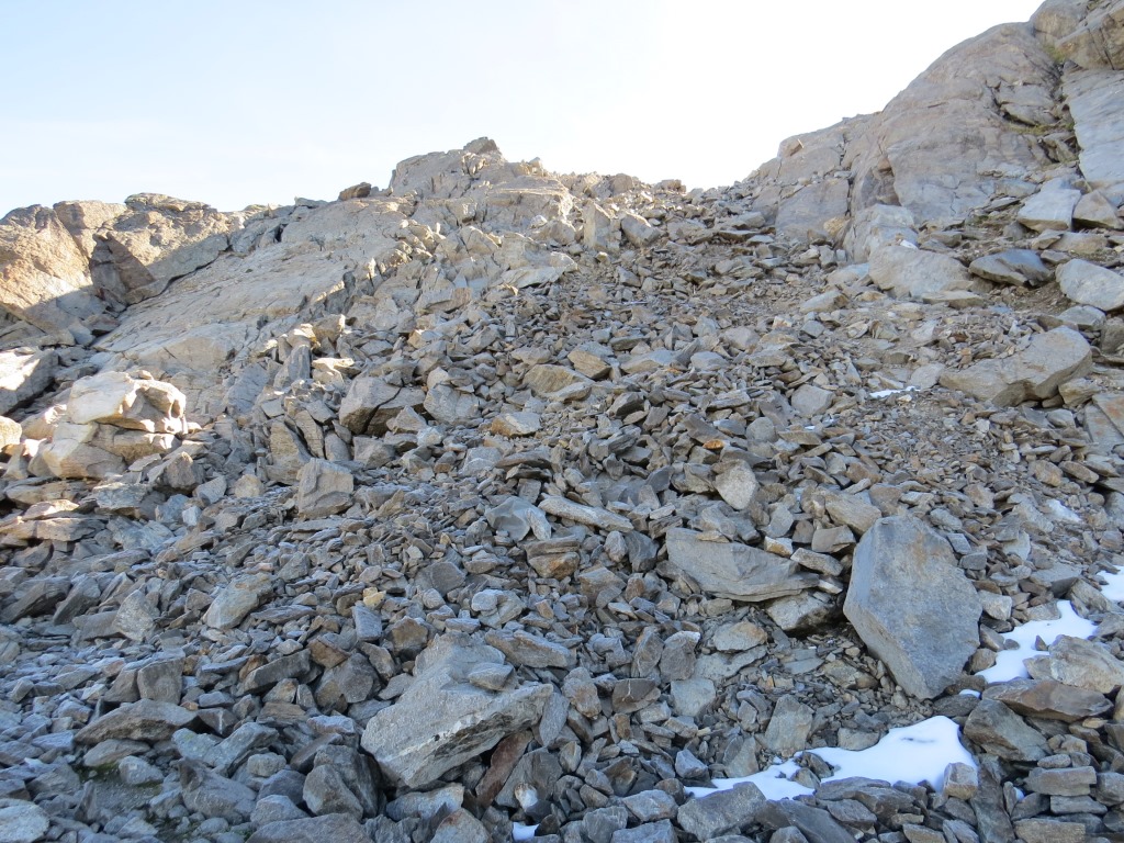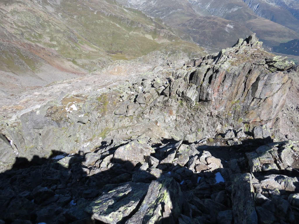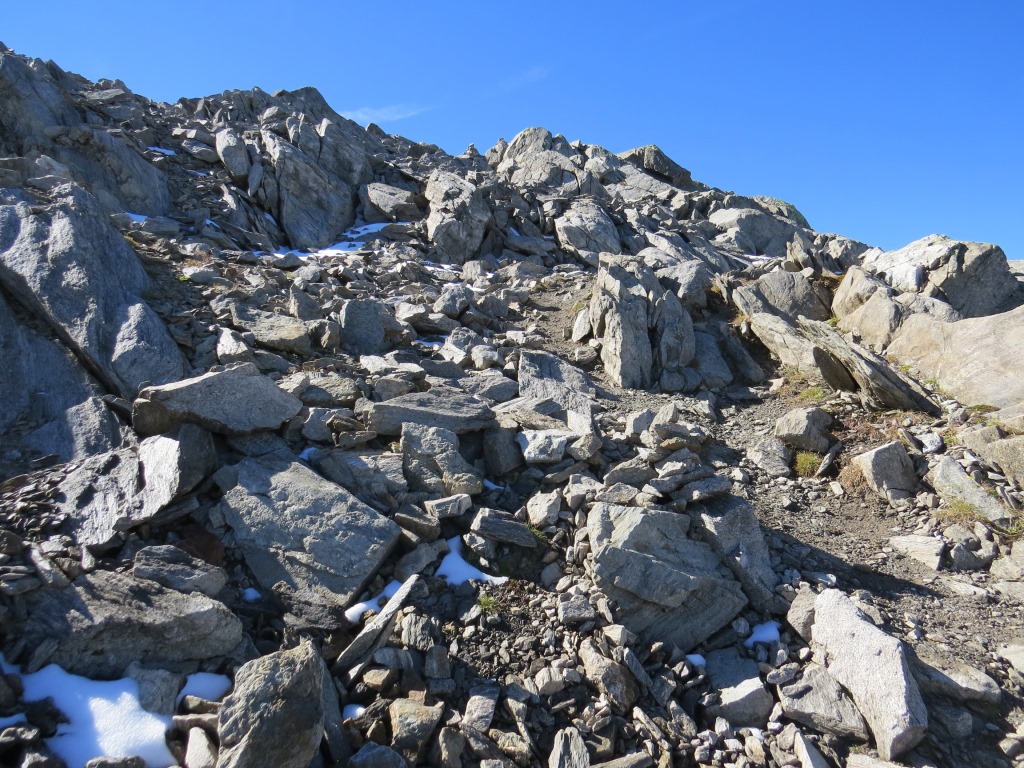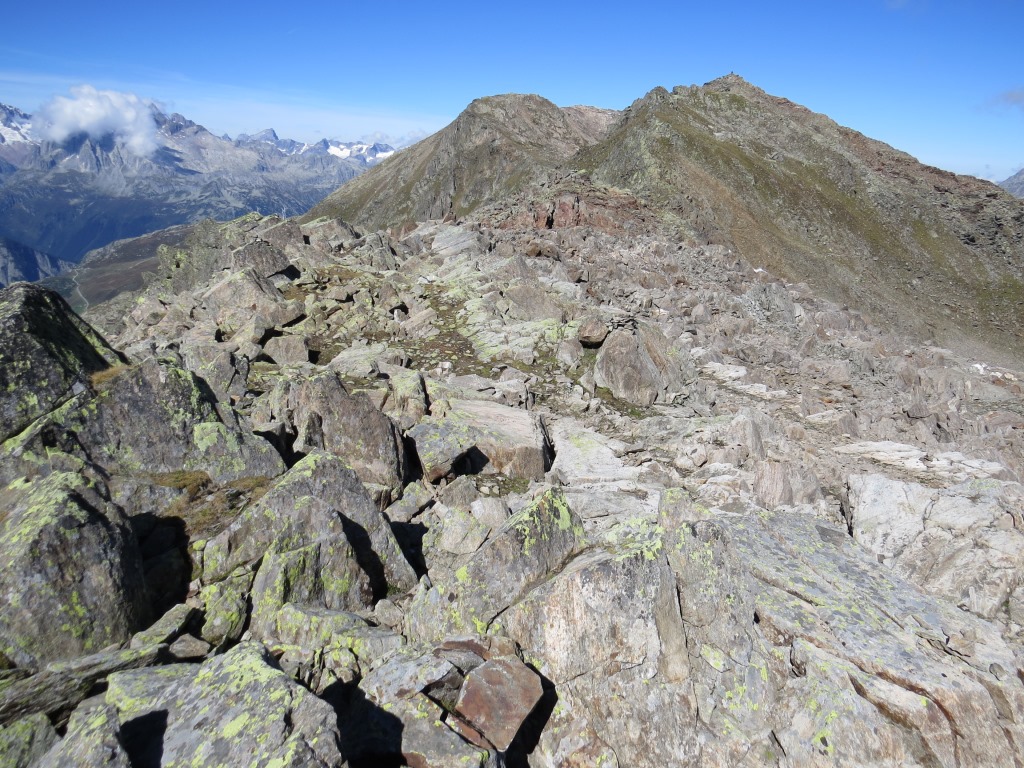 der Grat selbst besteht aus grobem Blockwerk und geschliffenem Fels...