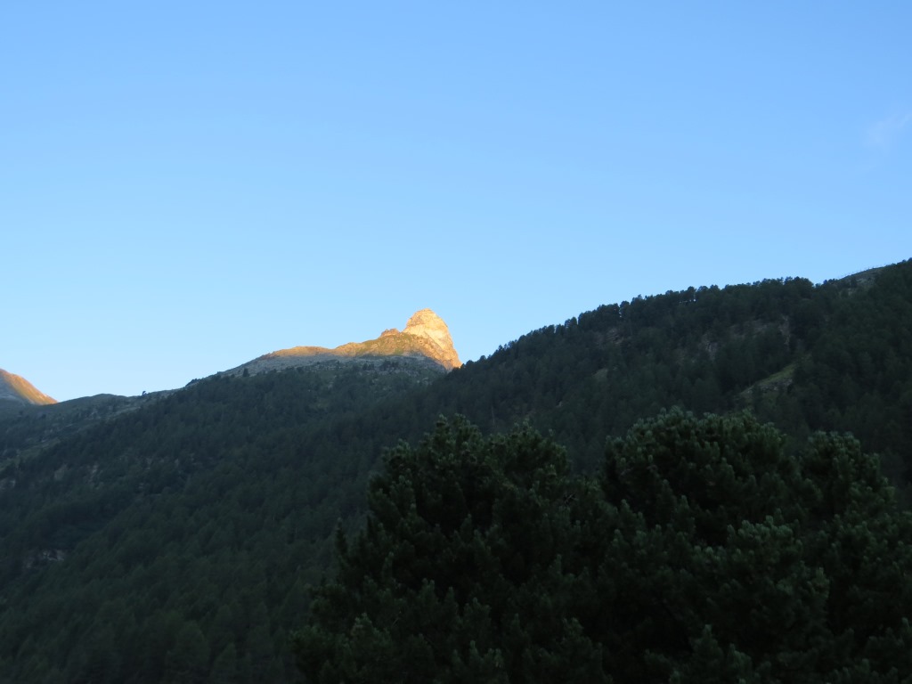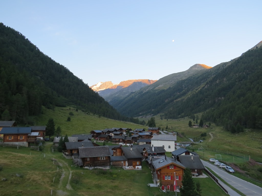 frühmorgens schauen wir aus dem Schlafzimmerfenster des Hotel Schwarzhorn, zum noch im Schatten stehenden Weiler Gruben-Meiden Datum 07.03.2019