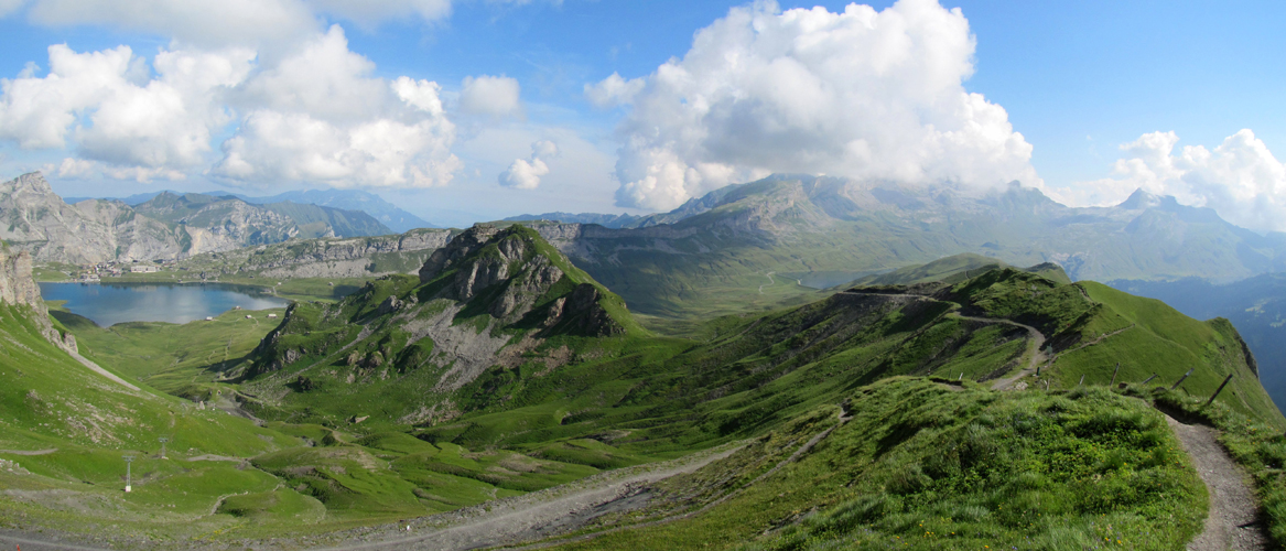 schönes Breitbildfoto vom Balmeregghorn aus gesehen. Links der Melchsee in der Mitte der Melchseestock