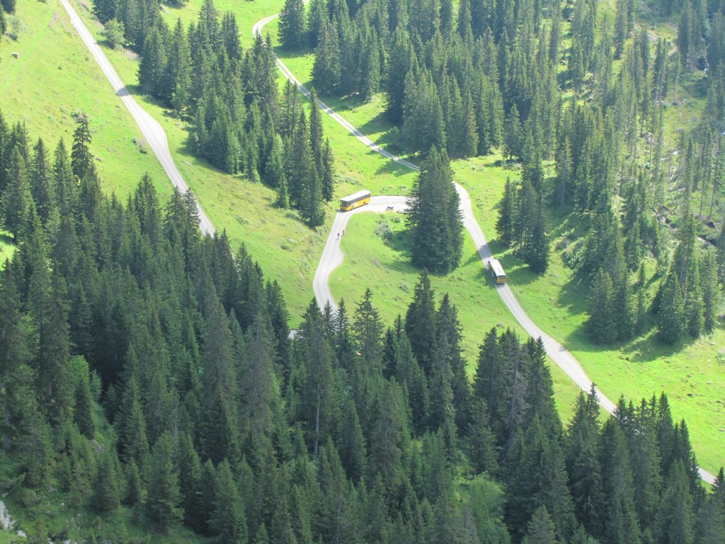 Tiefblick ins Gental. Ein Postauto fährt hinauf zur Engstlenalp