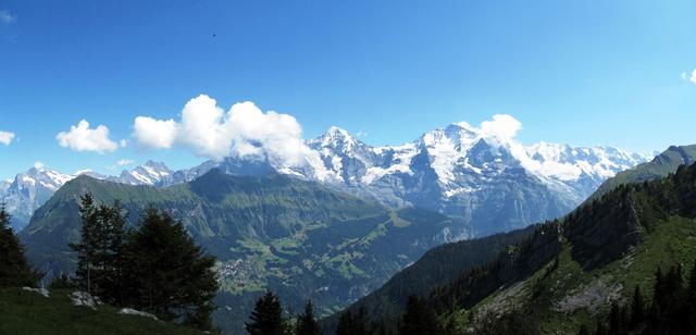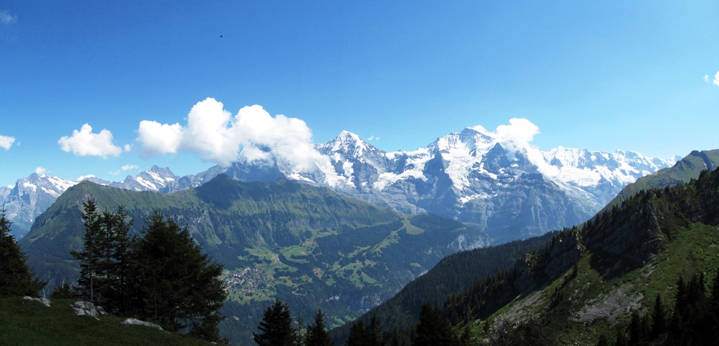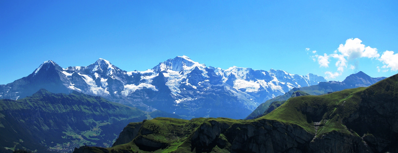 sehr schönes Breitbildfoto mit Eiger, Mönch, Jungfrau und Äbeni Flue. Ganz rechts der Bietenhorn, dort waren wir auch schon Datum 10.02.2017