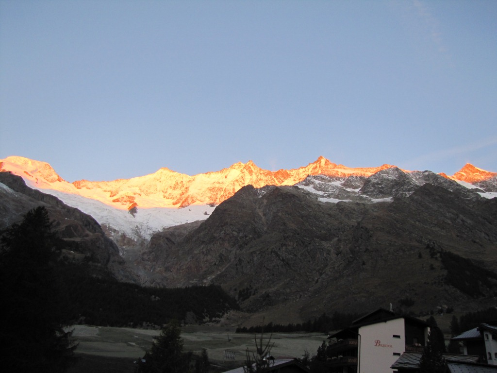 Sonnenaufgang im Gletscherdorf Saas-Fee. Alphubel, Täschhorn, Dom, Lenzspitze und Nadelhorn Datum 23.01.2014