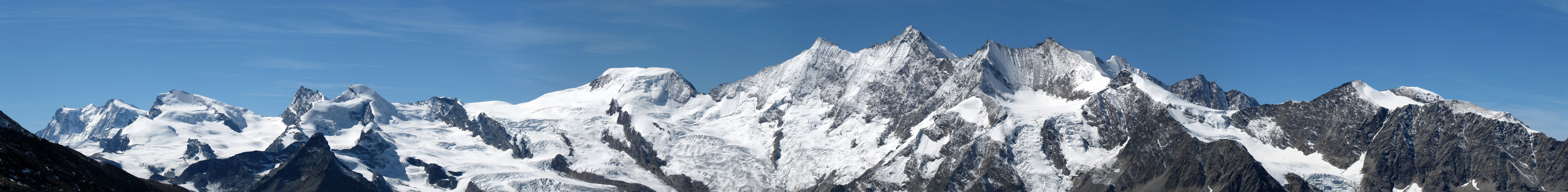 schönes Breitbildfoto mit Blick auf Triftgletscher, Weissmies und die anderen Viertausender. Der höchste ist der Dom Datum 13.02.2017