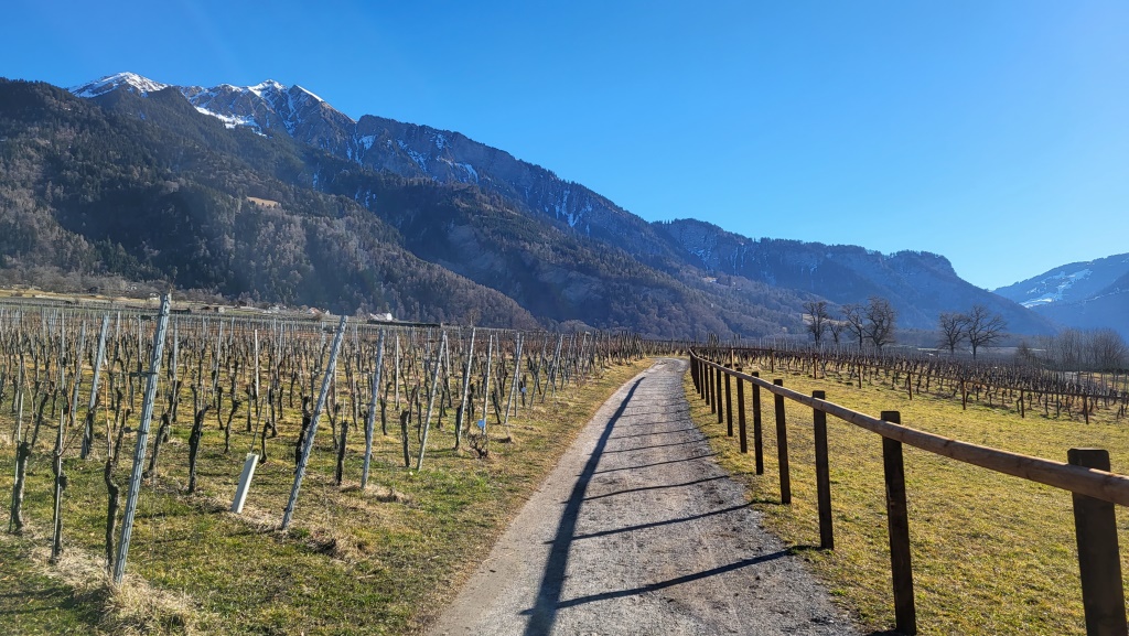 ...und wandern über Rebhänge leicht abwärts. Zeitgleich verlassen wir die Bündner Herrschaft