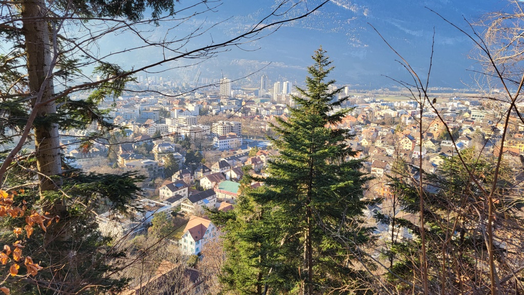 wir treten aus dem Wald und vor uns taucht in der Ebene Chur auf