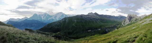 schönes Breitbildfoto von der "schlächti Matti" aus fotografiert. Links das Schilthorn, in der Mitte die Schwalmere