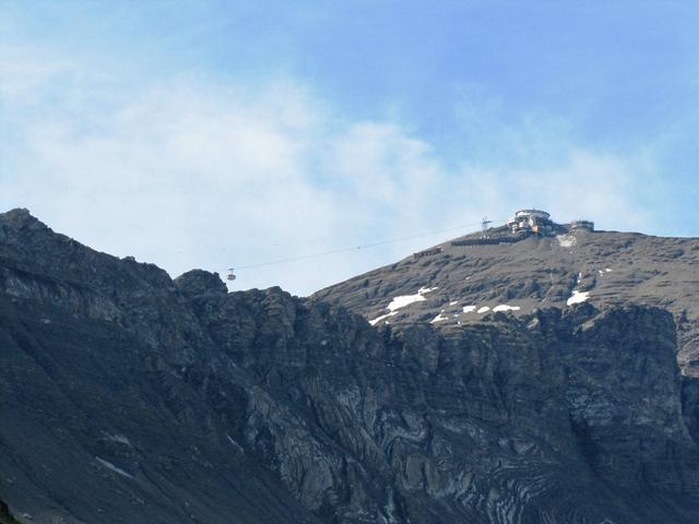 am Horizont die Mittelstation Birg der Luftseilbahn. Ein bisschen versteckt die Schilthornhütte
