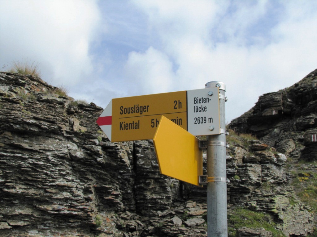 Wegweiser bei der Wegkreuzung auf der Sousegg 2140 m.ü.M.