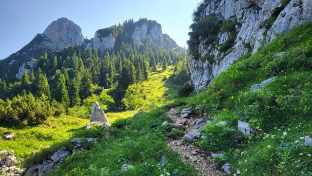 der Bergpfad führt uns zwischen Tannen und Legföhren, super schön Datum 20.12.2024