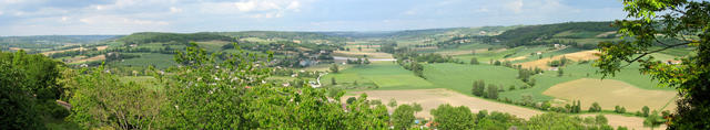 Breitbildfoto kurz vor Lauzerte. Wiesen, Felder und Wälder, soweit das Auge reicht