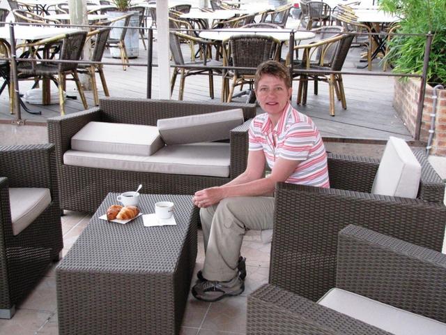 Mäusi geniesst ein kleines Frühstück auf der Terrasse des Hotel du Commerce