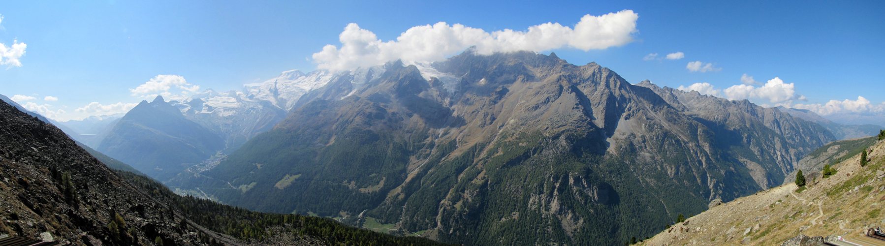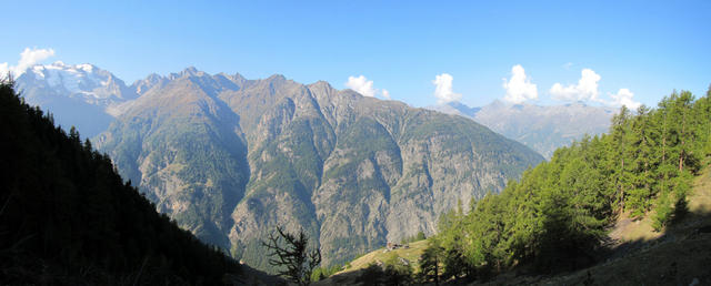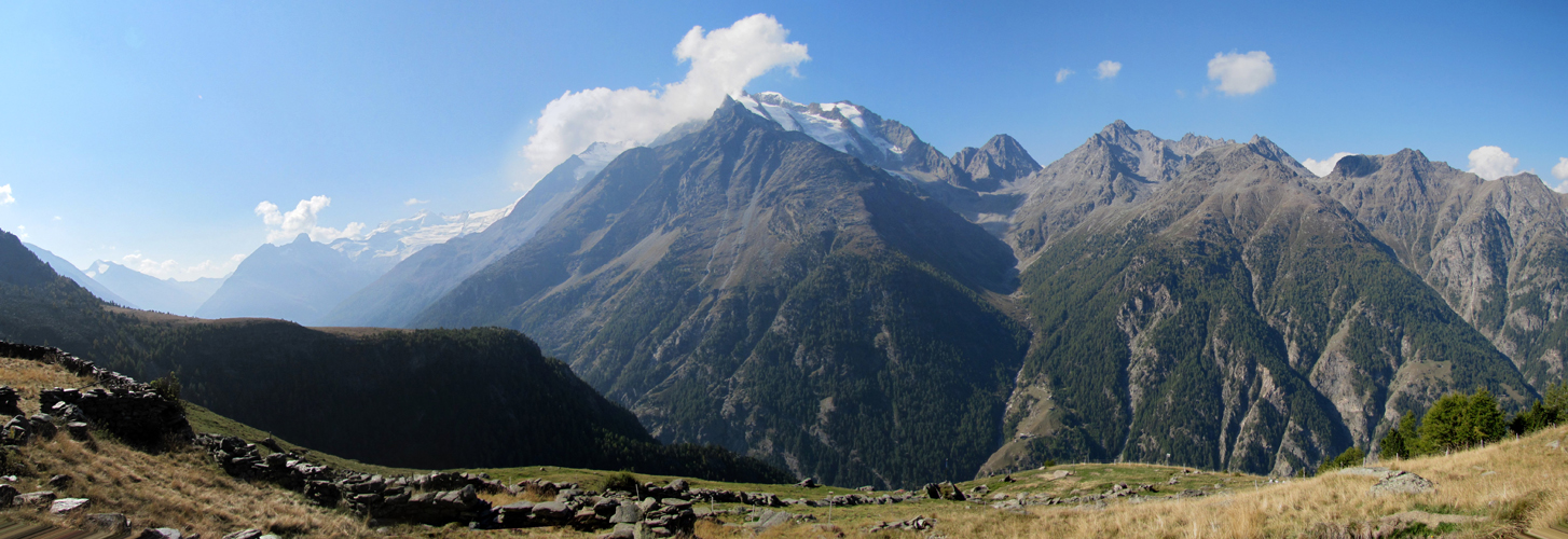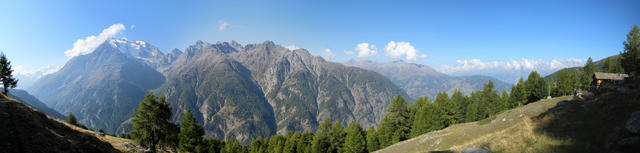 Breitbildfoto bei der Bergstation von Gspon. Links Mischabelgruppe, Seetalhorn, Weisshorn, und Bishorn