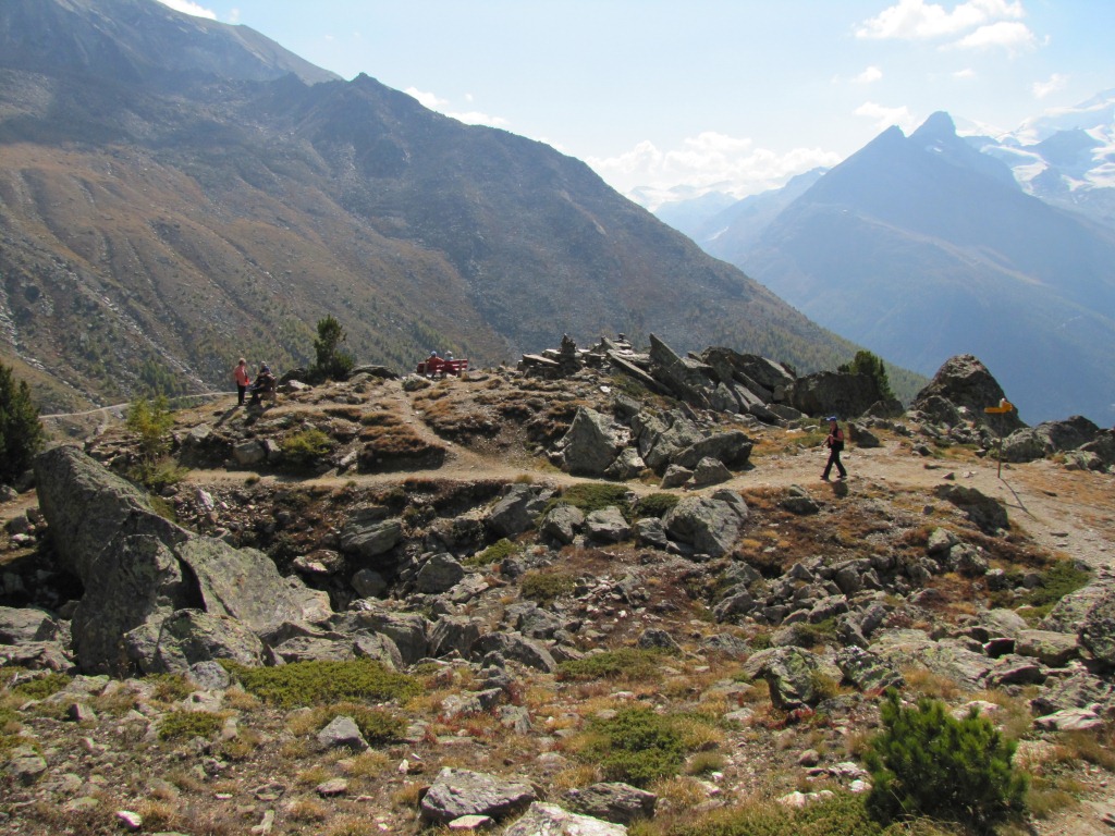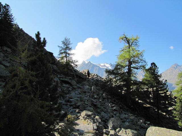 wir haben den Aussichtspunkt Hannig erreicht. Der Blick auf das Dreigestirn Fletschhorn, Lagginhorn und Weissmies ist gigantisch
