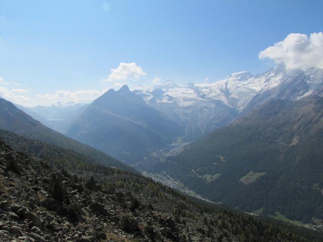 Blick zum Balfrin und die Mischabelgruppe und auf das tief eingeschnittene Saastal