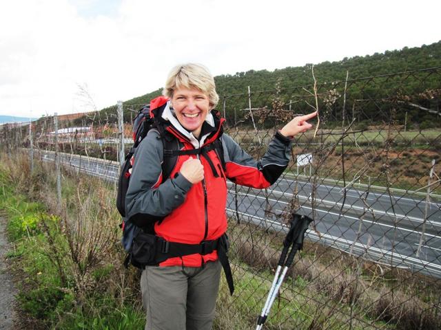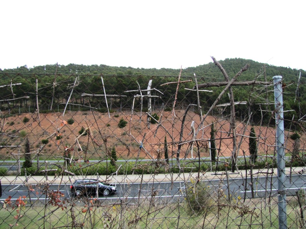 der Camino verläuft hier für ein kurzer Stück, der Autobahn entlang. Am Zaun sind tausende von Holzkreuzen angebracht