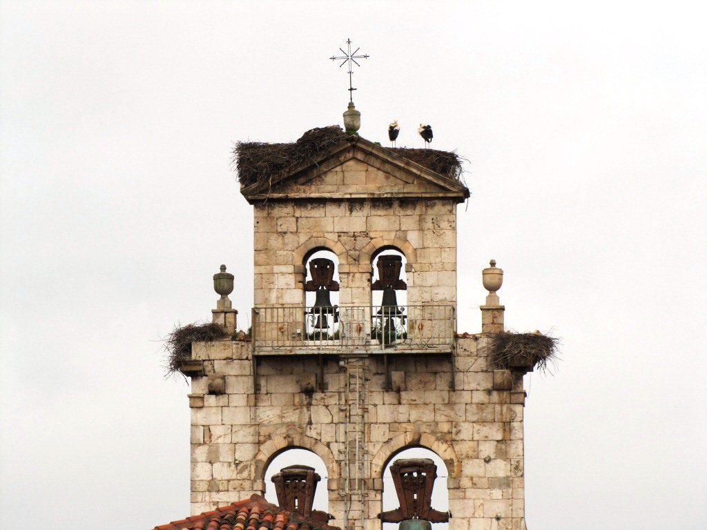 Kirchturm der Kirche San Pedro de la Fuente ist von Störchen belagert