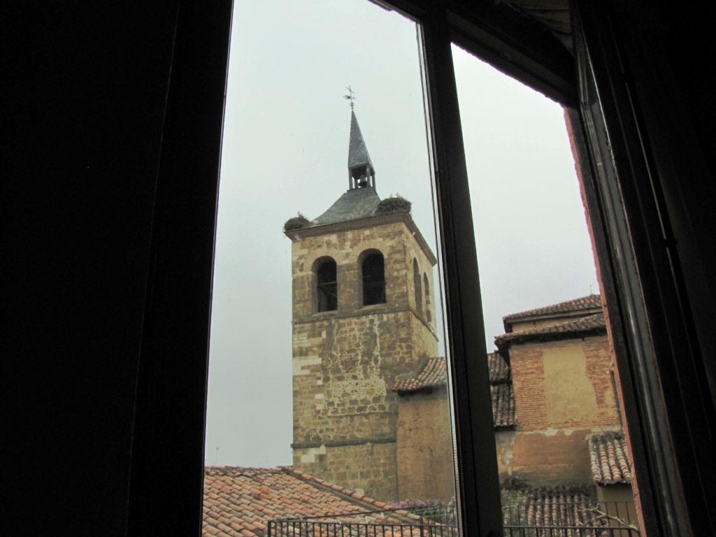 Blick vom Hotelzimmer zum Kirchturm mit Storchennester Datum 03.09.2012