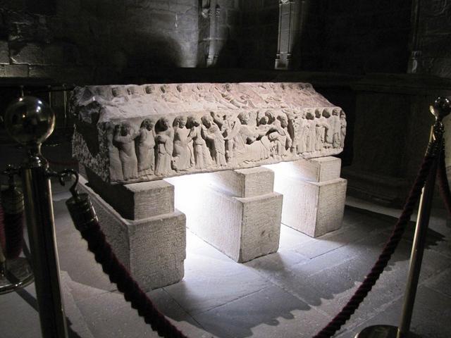 der interessanteste Sarkophag steht genau in der Mitte. Die romanischen Reliefs zeigen Sterbeszenen