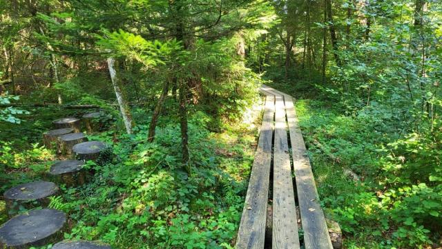 über einen Holzsteg kann der sumpfige Moorwald auf einem Rundgang erkundet werden Datum 05.09.2025