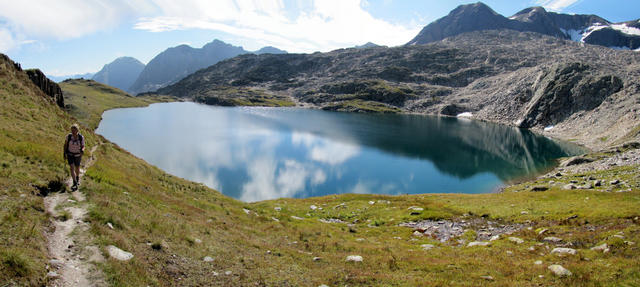 wir haben den Übergang beim Distelgrat bei Punkt 2660 m.ü.M. erreicht, und schauen hinunter zum wunderschönen Distelsee