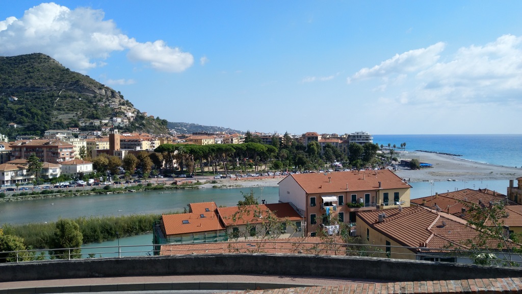 über den Fluss Roia blicken wir zurück zur Altstadt von Ventimiglia und der romanischen Kirche
