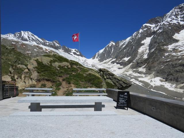 schönes Breitbildfoto von der Terrasse der Anenhütte aufgenommen, mit Blick auf den Langgletscher Datum 23.02.2017
