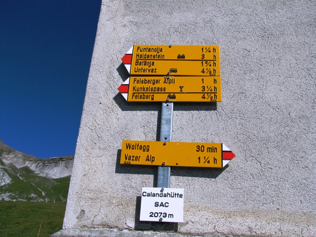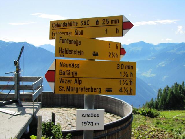 Wegweiser bei Altsäss. Weiter geht es zur Calandahütte Datum 23.03.2013