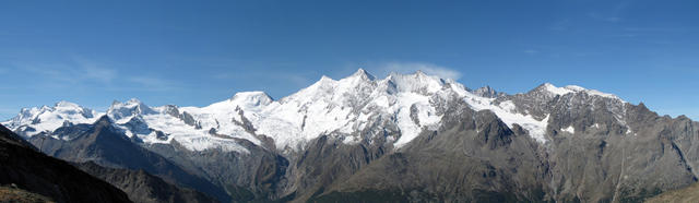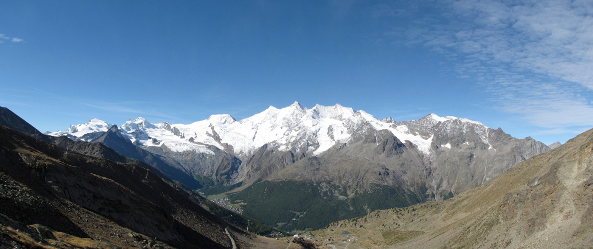 schönes Breitbildfoto mit Blick auf Triftgletscher, Weissmies und die anderen Viertausender. Der höchste ist der Dom Datum 13.02.2017