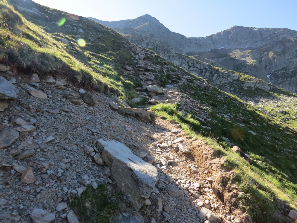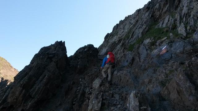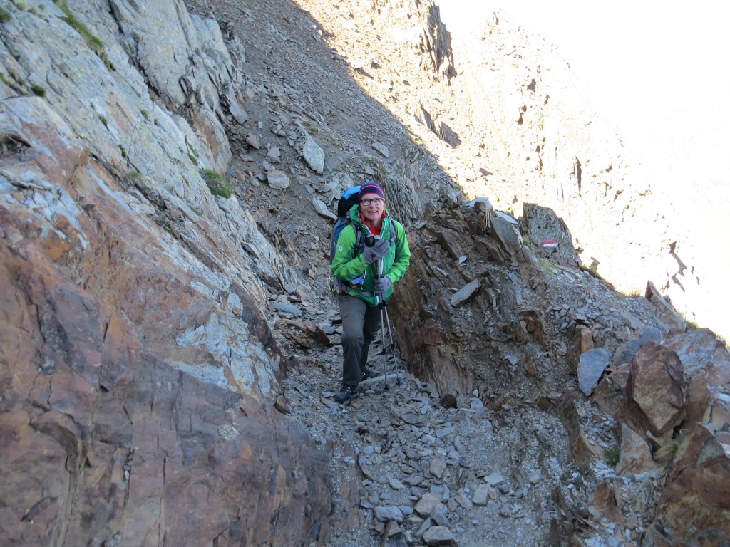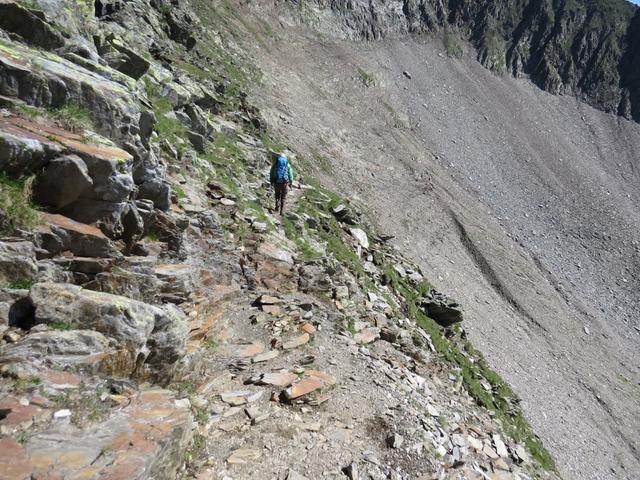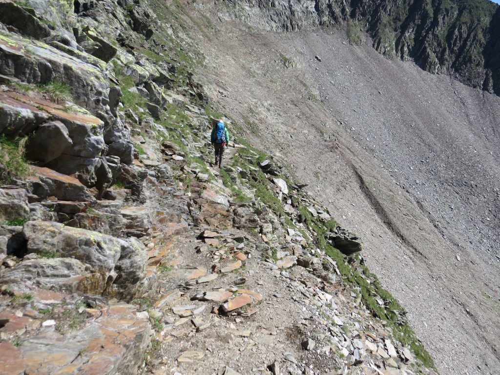über einen ausgesetzten Geröllpfad steigen wir auf der anderen Seite ab