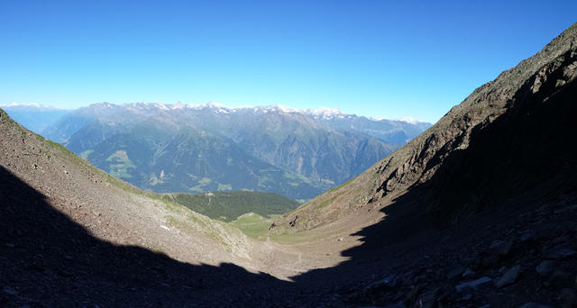 Blick vom Missensteiner Joch 2128 m.ü.M. hinunter nach Meran 2000 unser Tagesziel