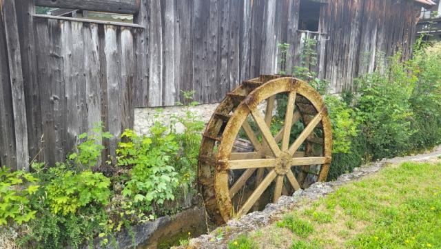zur linken sehen wir im Ortsteil Mühltal die alte Getreidemühle mit dem grossen Wasserrad