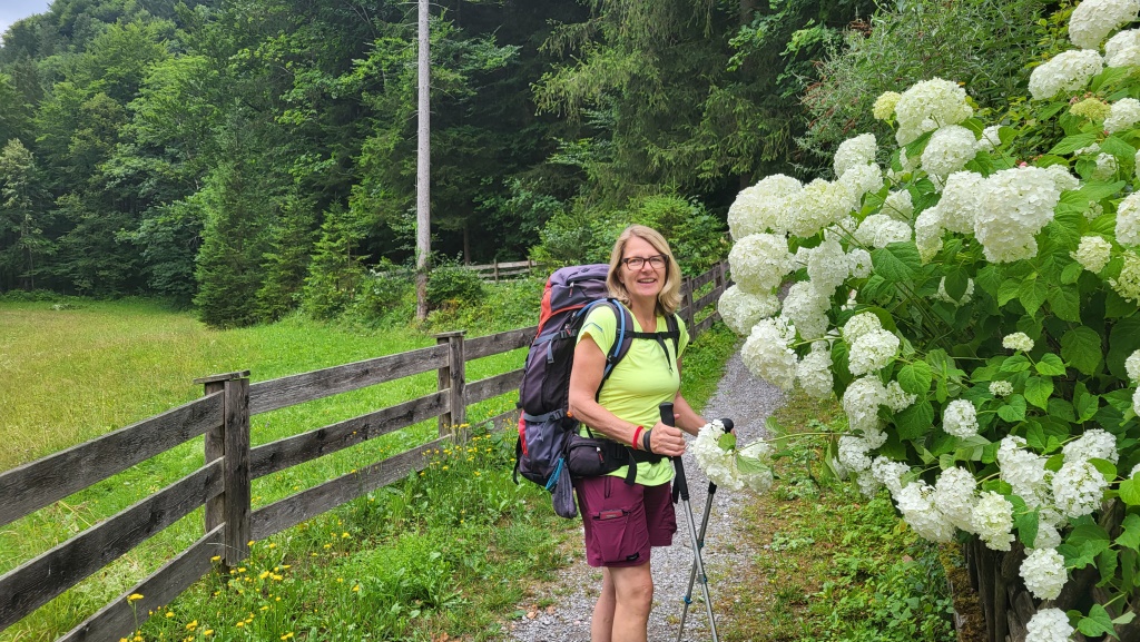 der Maximilianweg und der E4 biegt in eine Asphaltstrasse hinein, die so gut wie keinen Verkehr aufweist