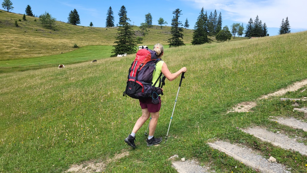 ein steiler Aufstieg bringt uns über einen Zick-Zack-Weg, hinauf zur Seitenalm mit grossem Holzkreuz