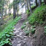durch einen abschüssigen und teilweise bewaldeten Hang geht es danach abwärts. Bei Nässe sumpfig und rutschig