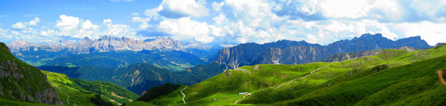 sehr schönes Breitbildfoto der Fanes Gruppe links und die Puez Gruppe rechts