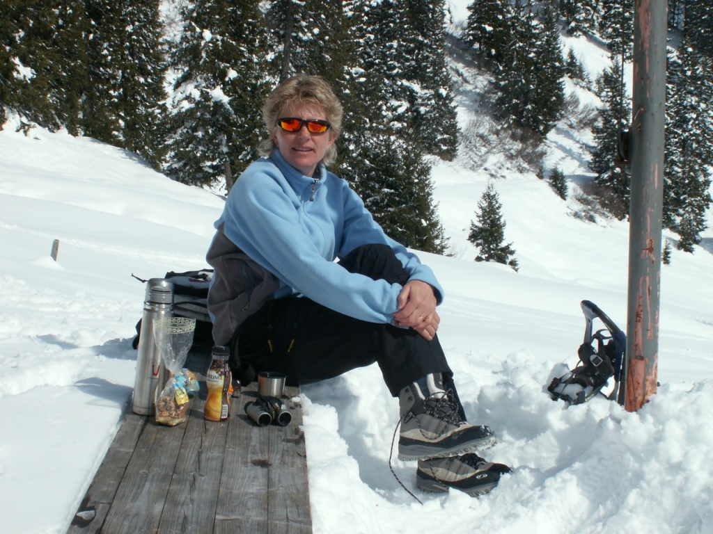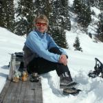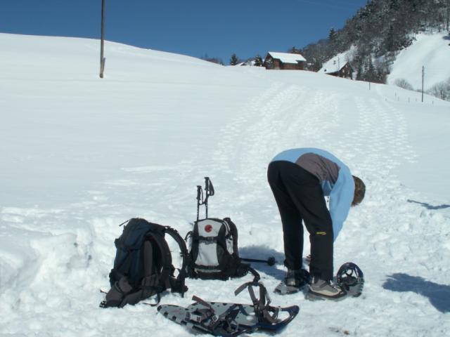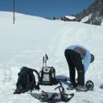 Mäusi beim anschnallen der Schneeschuhe