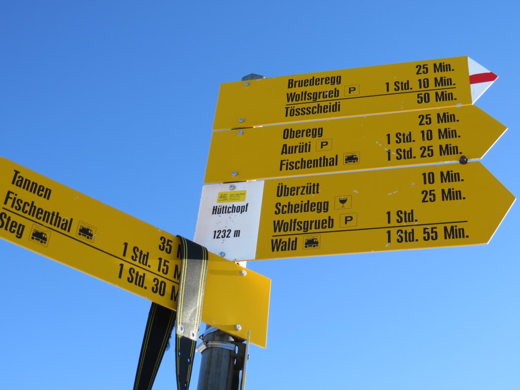 Wegweiser in Fischenthal. Unser erstes Ziel ist der Hüttchopf Datum 29.04.2015