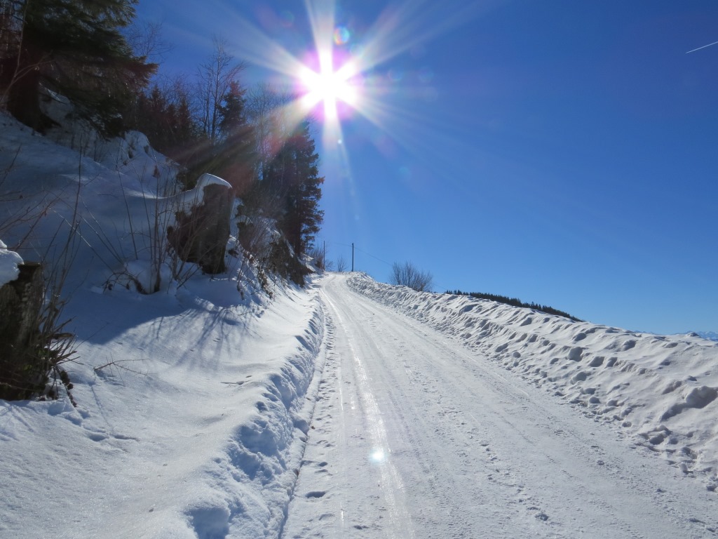 auf der schneebedeckten Strasse laufen wir hinauf nach Langenberg Datum 29.04.2015