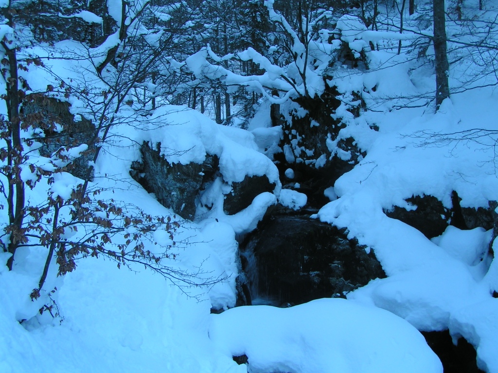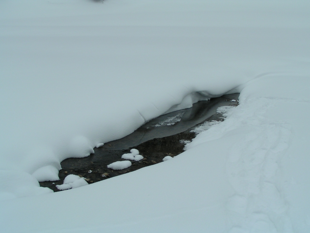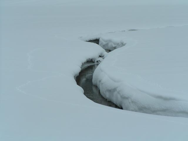 ein Bach der fast mit Schnee zugedeckt ist