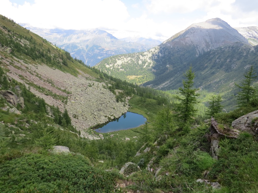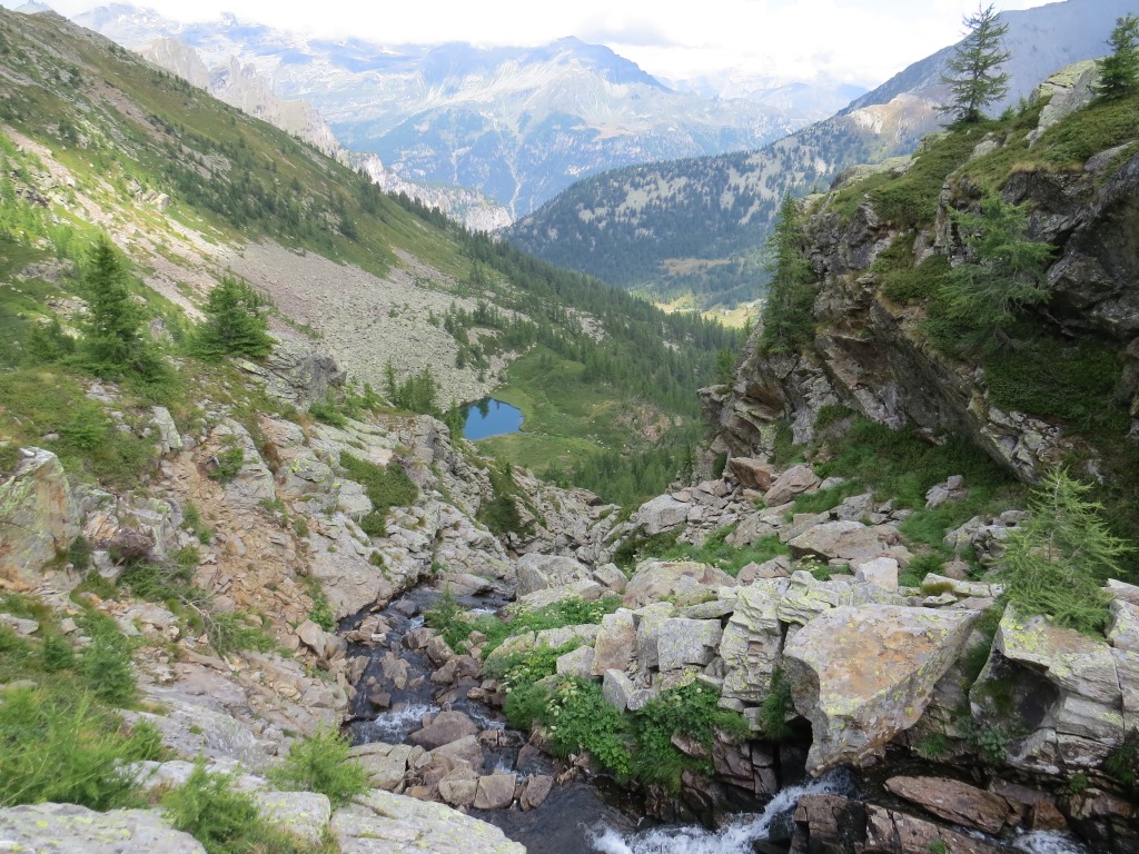 beim Abfluss des Tschawinersee blicken wir hinunter zum Wairasee und zum Seehorn