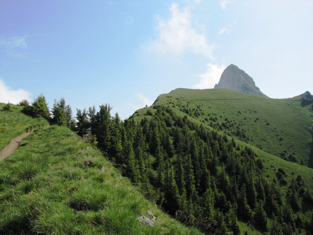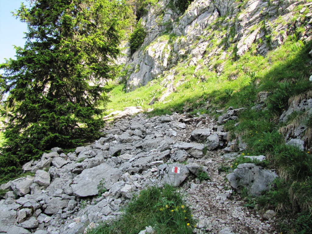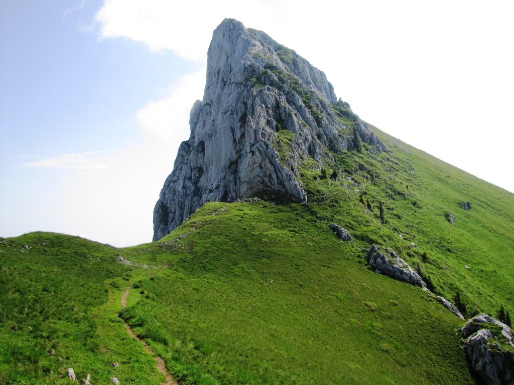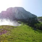 Blick hinauf zum Stockhorn. Rechts von der Kalkwand, führt der Bergweg vorbei