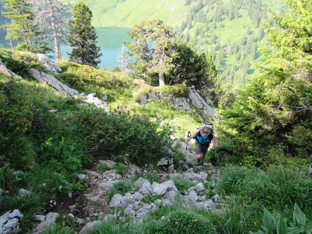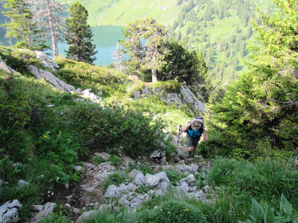 Tiefblick zum "normalem" Bergweg, der vom Hinterstockensee hinauf zum Stockhorn führt