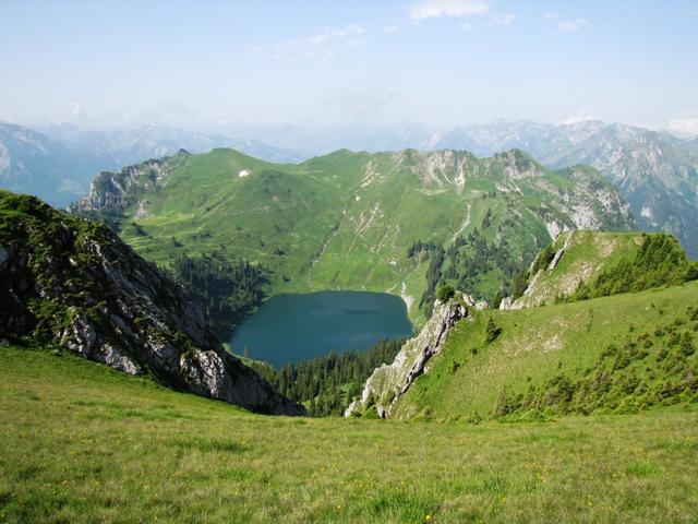 Tiefblick zum Oberstockensee. Von hier oben sieht der See wie ein Vulkankrater aus