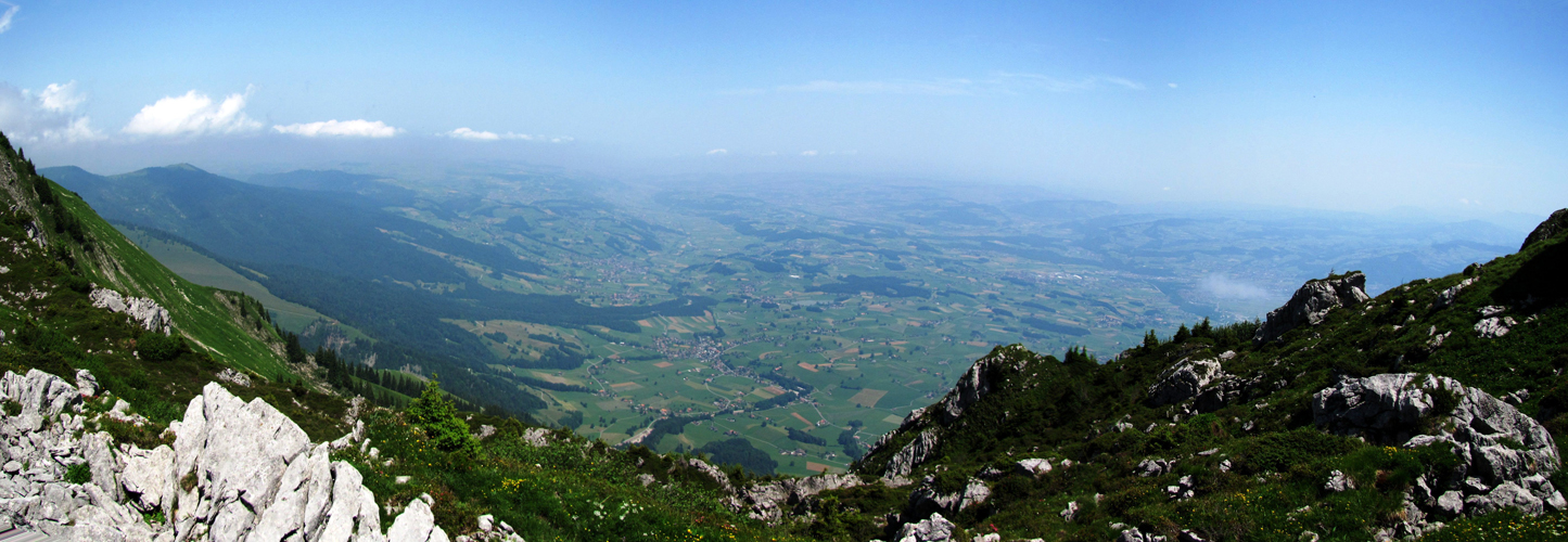 schönes Breitbildfoto mit Blick ins Mittelland. Die Sicht reicht bis ins Jura