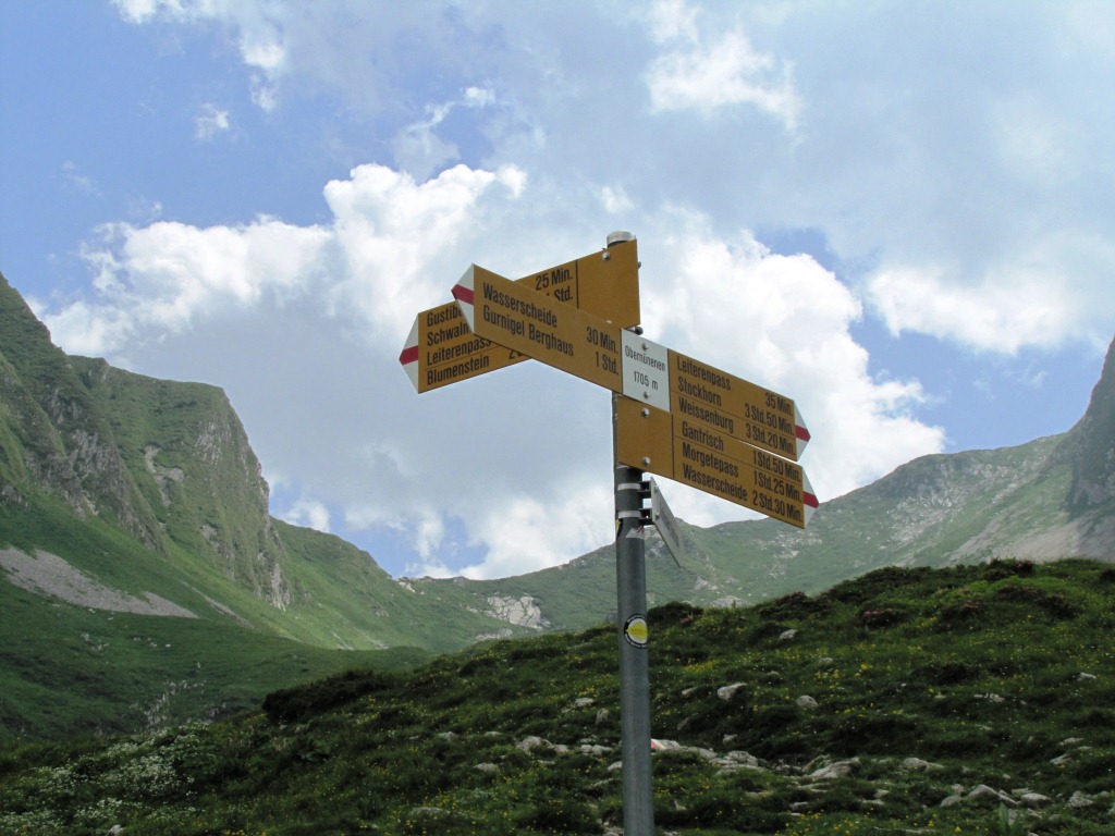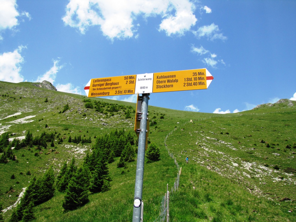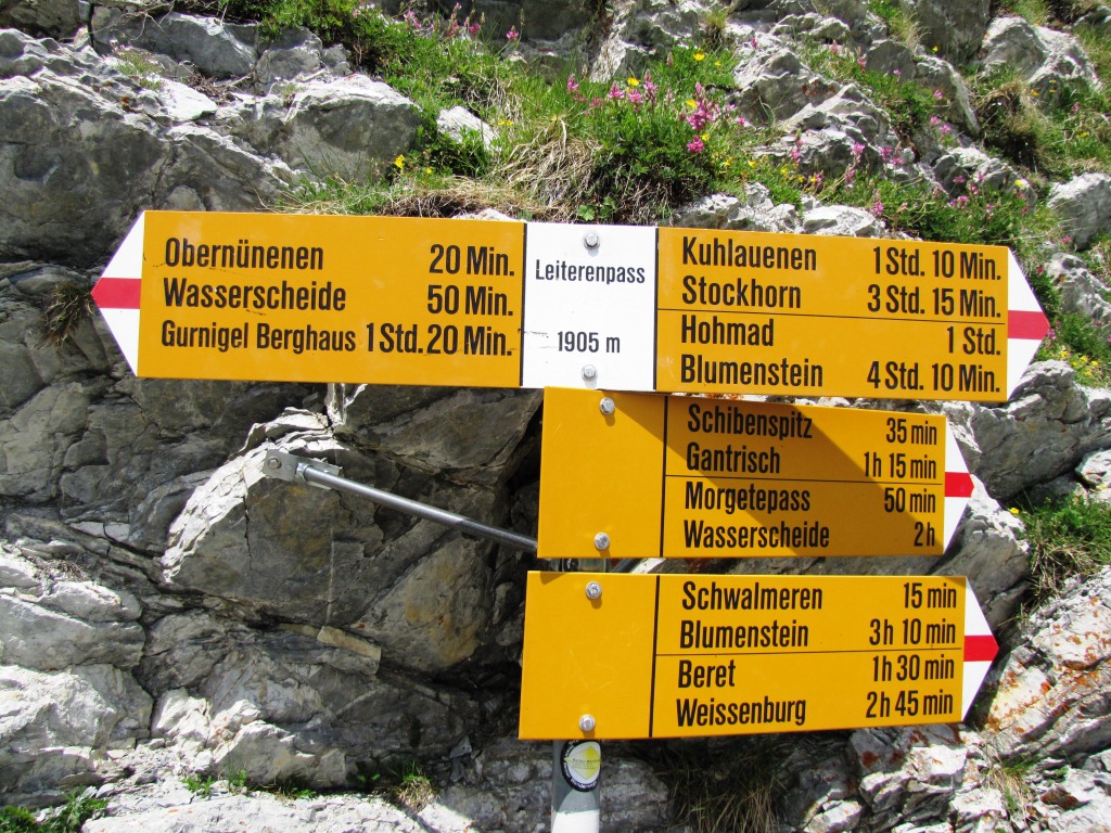 Wegweiser bei Schiterwang 1850 m.ü.M. unser nächstes Ziel, der Leiterenpass