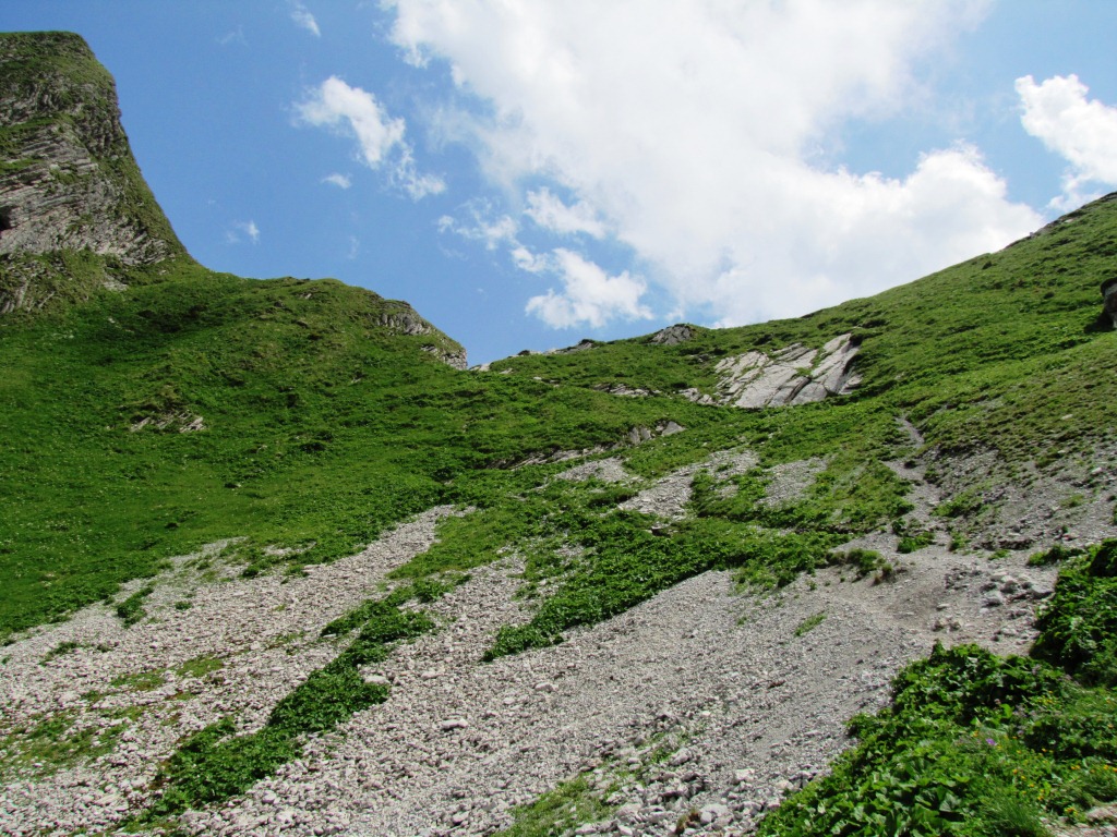 Blick hinauf zum Leiterenpass. Links die Alphütte Obernünene (Einkehrmöglichkeit)